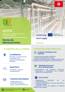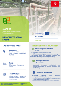 - At the selected AVFA (Agence de la vulgarisation et de la formation agricoles) demonstration farm, MAENA project will set up a smart irrigation system specifically for the citrus trees, supported by centralised data logging to optimise resource use. Additionally, an existing hydroponic greenhouse will be rehabilitated, where upgraded structural and mechanical systems enable smart fertigation and precise climate control to restore efficiency and boost yields.