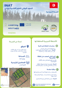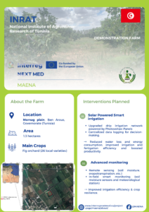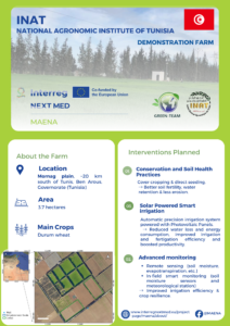 - INAT (Institut National Agronomique de Tunisie) demonstration farm will prioritize conservation and soil health practices. Key interventions include the use of cover cropping and direct seeding, which are designed to enhance soil fertility, improve water retention, and significantly reduce erosion. To complement these soil-based practices, the farm will be equipped with a solar-powered smart irrigation system. This automatic precision system will utilise photovoltaic panels to simultaneously reduce water loss and energy consumption, while boosting overall crop productivity.